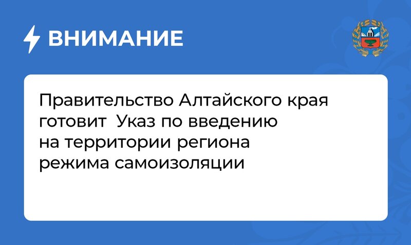 В соответствии с указом главы региона жителям Алтайского края предписано не покидать места проживания (пребывания), за исключением случаев обращения за экстренной (неотложной) медицинской помощью, случаев иной прямой угрозы жизни и здоровью, а также случаев следования к ближайшему месту приобретения товаров первой необходимости, а также с целью выгула животных на расстоянии не больше 100 метров от места проживания (пребывания), выноса отходов до ближайшего места их накопления.