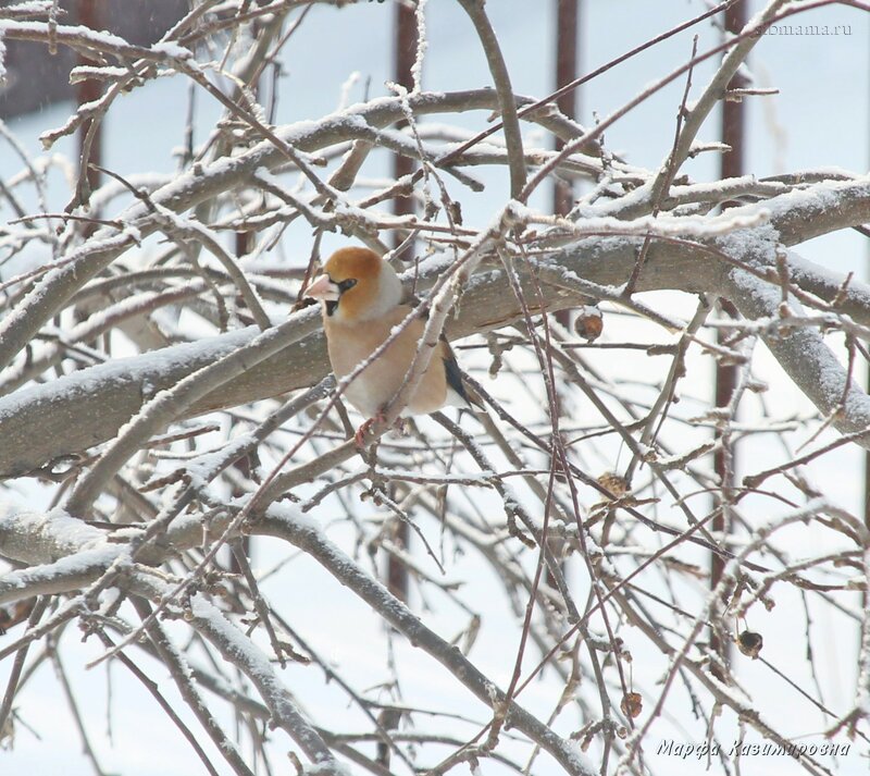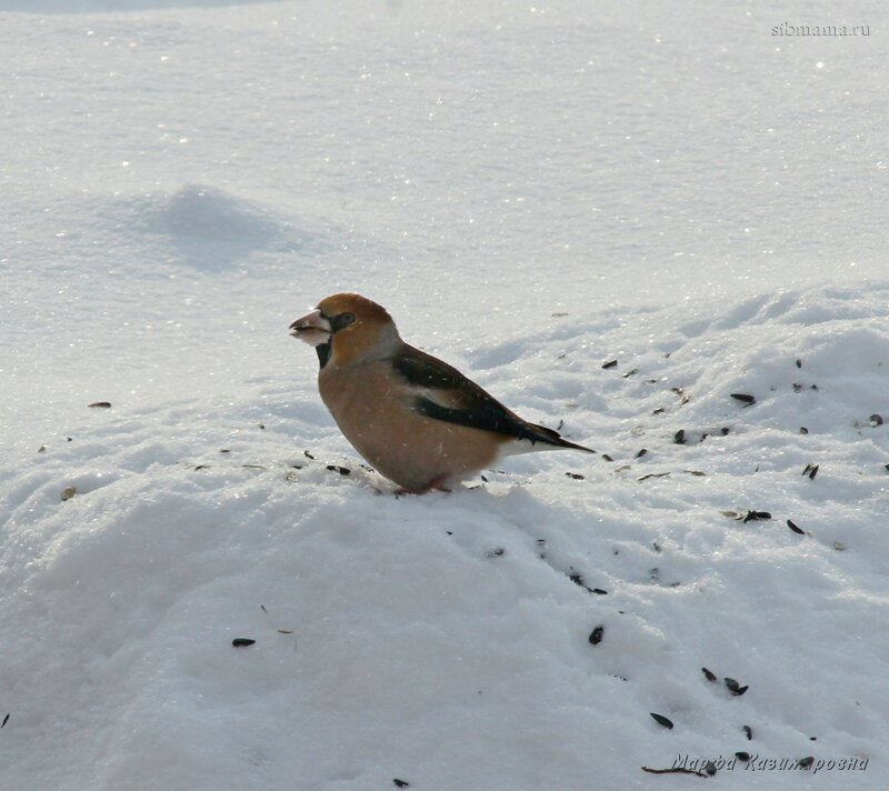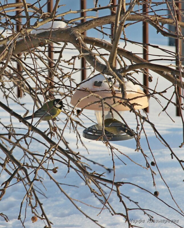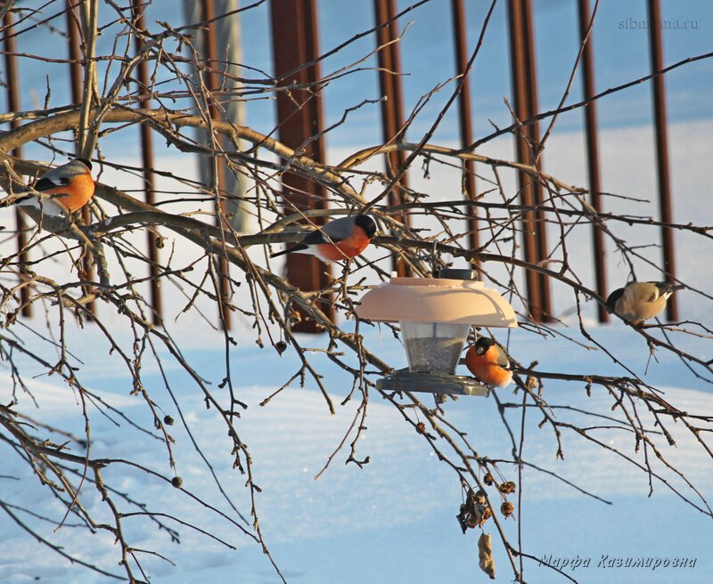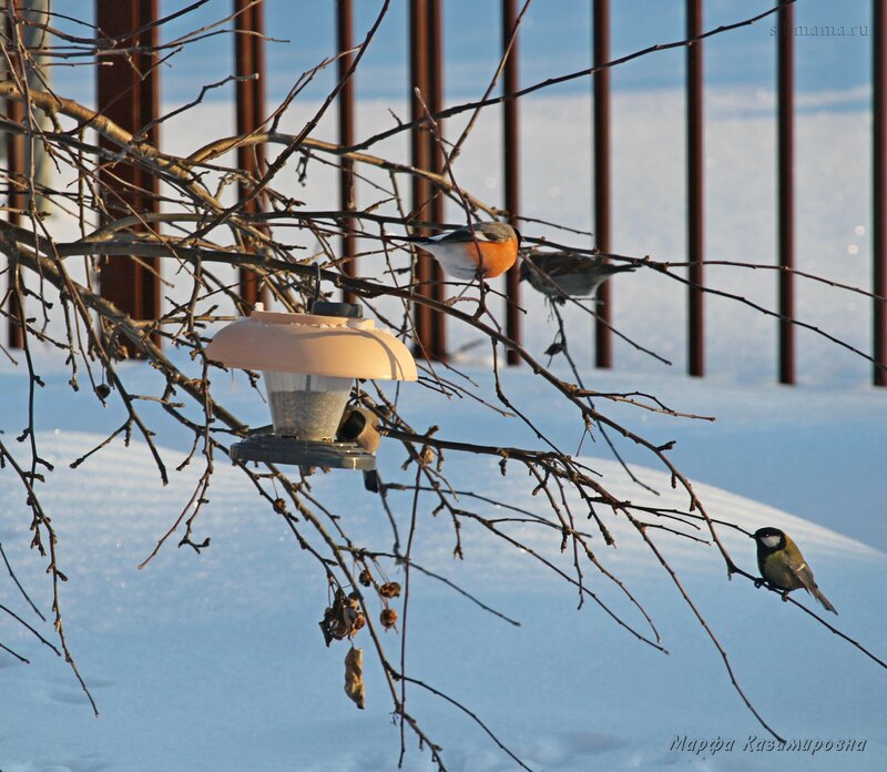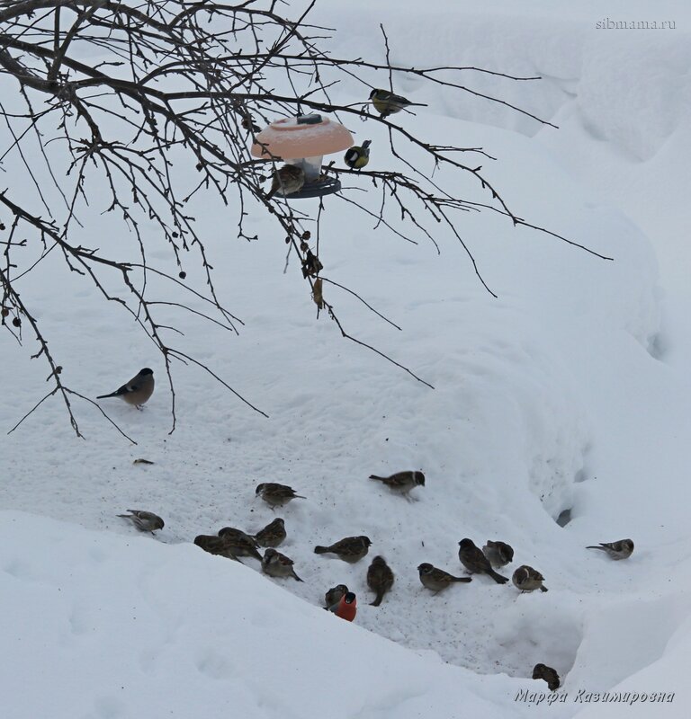 мы переехали в свой дом, и теперь у меня есть кормушка на участке. Прилетают правда в основном синицы да воробьи и иногда снегири со свиристелями и две чечетки