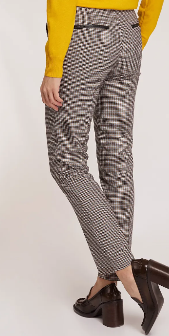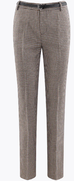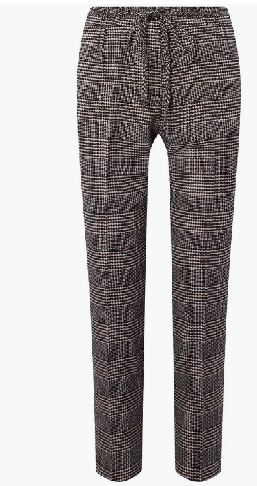1. Прямые зауженные брюки на завязках и с боковыми карманами. Ткань проста в уходе, отлично сохраняет изначальный цвет и вид. Эта модель гармонично сочетает стили casual (эластичный пояс на кулиске обеспечивает удобную посадку по фигуре, добавляет образу расслабленный штрих) и классику (стрелки на штанинах и узор гусиная лапка).