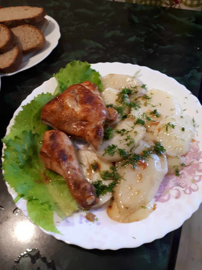 Маринованные окорочка, запеченные в духовке, гарнир - печеный картофель и овощи