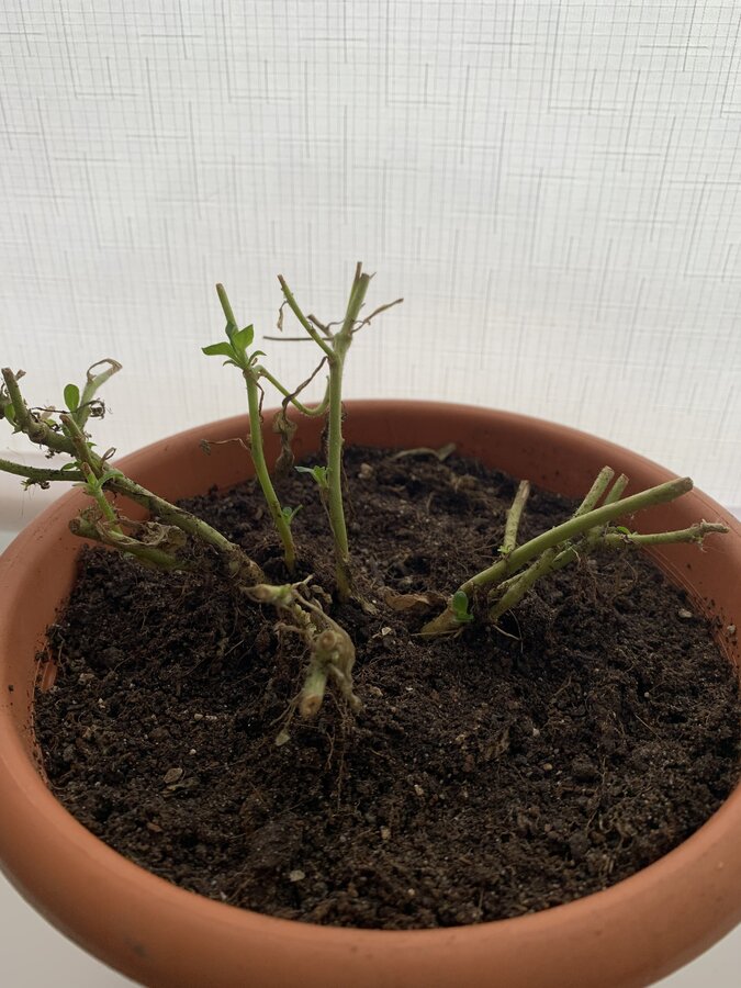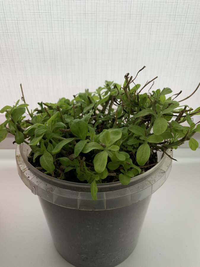 Максимально отрываем корни, обрезаем куст и садим в маленькую емкость. У меня были под рукой маленький горшок и ведерко. Результат на фото: через две недели одна петуния уже кучерявится, вторая начала давать зелёные листики. Черенковать к сожалению осенью у меня ну никак не получалось. А это прекрасный вариант! Спасибо :girl_flower: