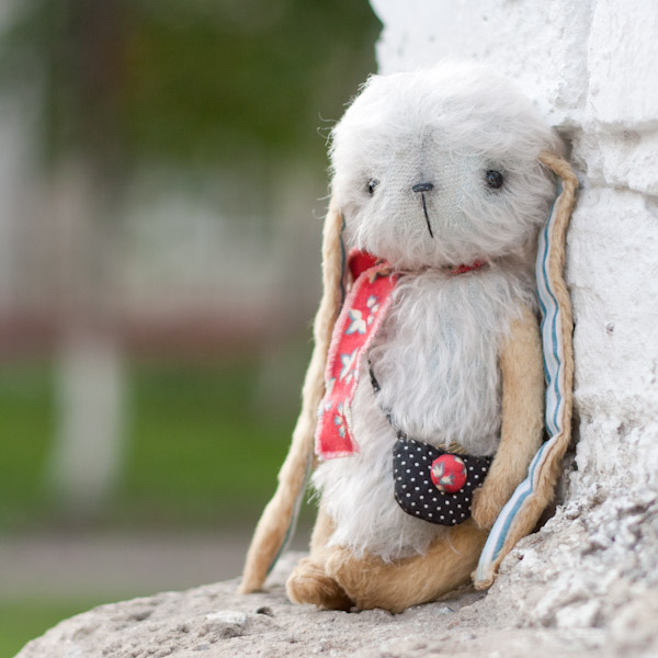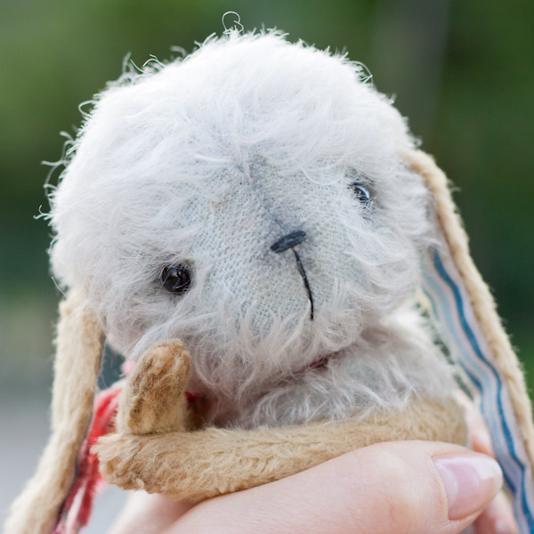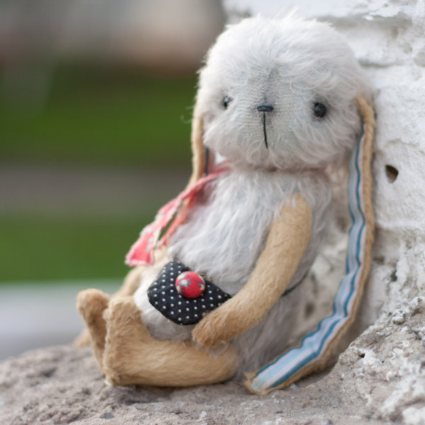 У меня новая зая, правда сшила я ее давно, еще в начале лета, просто сфотографировала ее только сейчас. :aga-aga: Зайка ростом около 18 см, сшита из мохера и вискозы, набита опилочками и металлическим гранулятом, глазки стеклянные, тонировка маслянными красками. В ушках немножко стеклянного гранулята для тяжести. :-)