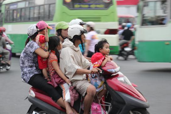 И не только семья - они на них даже мебель превозят . Машин там мало - в большей степени это такси. В том же Дананге - почти миллионном городе - все полосы заняты мотоциклистами. У них даже мода есть шлемов. В крупных ТЦ отдела, в супермаркетах стеллажи с "касками".