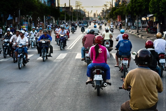 И чтобы машине пробраться сквозь них - нужно ехать в правом ряду и нажимать на сигнал - почти постоянно . И со светофорами туговато во Вьетнами. Как пример - в Нячанге - чтобы перейти к пляжу в центре города, нужно использовать тактику. Идешь через дорогу, встал, тебе объехали, снова идешь, встал... Реально там поток - главное не бежать .
