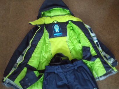 размер 122, состояние очень хорошее, из следов носки-только «расплыв» чёрного цвета на жёлтый по внутренней части штанин, цвет очень красивый, капюшон и мех отстегиваются