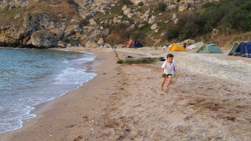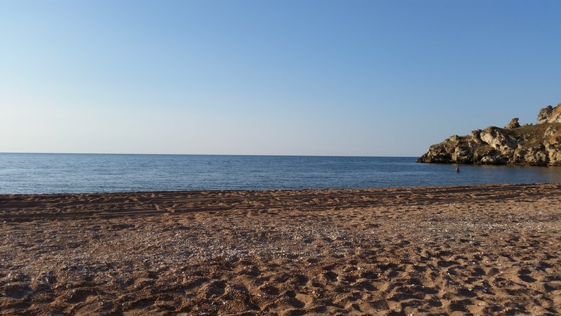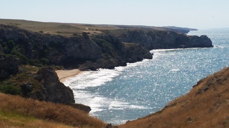 Мы заехали в Крым и сразу на генеральские пляжи на азовское море. Для любителей палаточного отдыха. Очень красивые места, бухты с Песчано-ракушечным пляжами. Цивилизации никакой, даже связи.