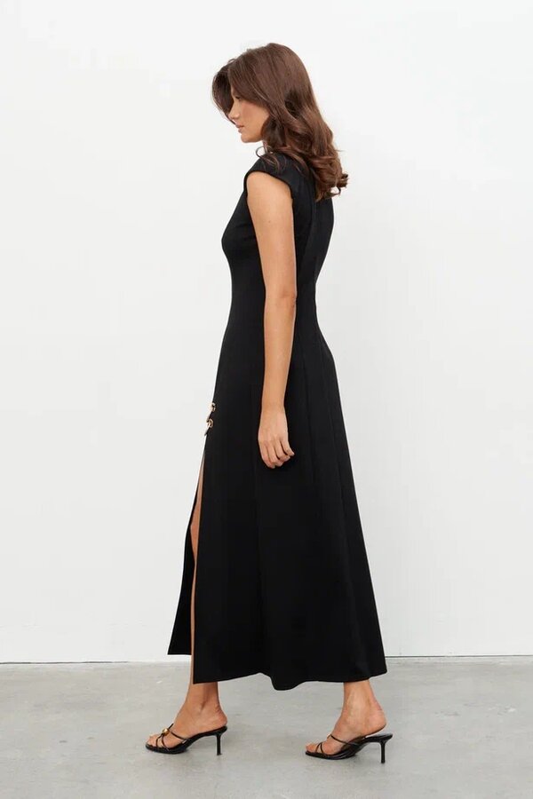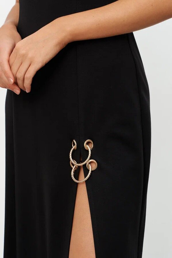 • Платье из трикотажного полотна приталенного силуэта с расклешённой юбкой с высоким разрезом. Вырез горловины V-образный, По плечам - плечевые накладки. Верх разреза отделан люверсами и кольцами в качастве декора. Застёжка на потайную молнию сзади. Скрыть
