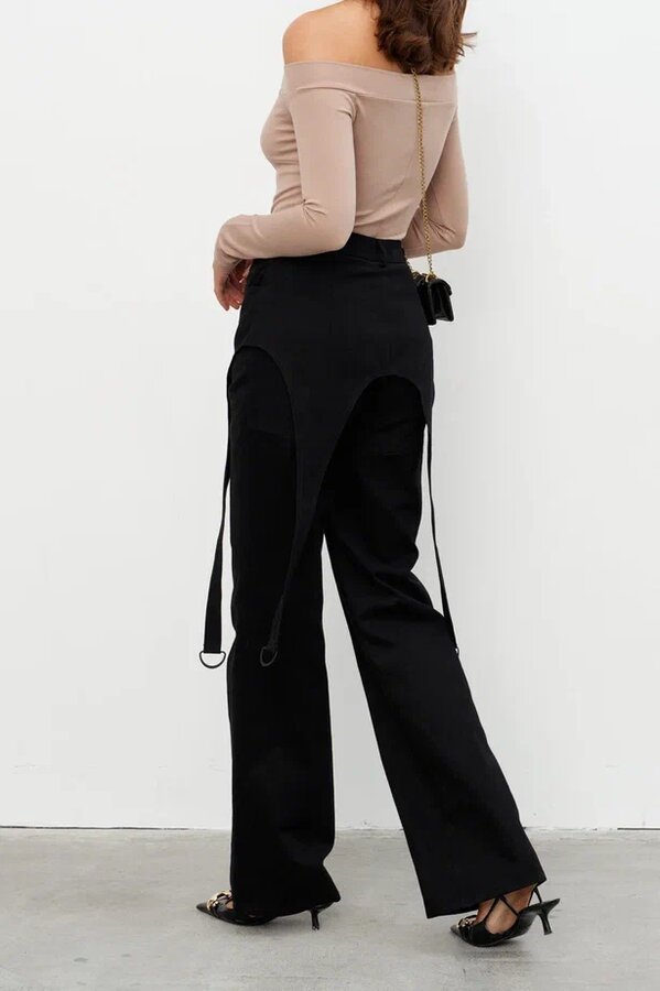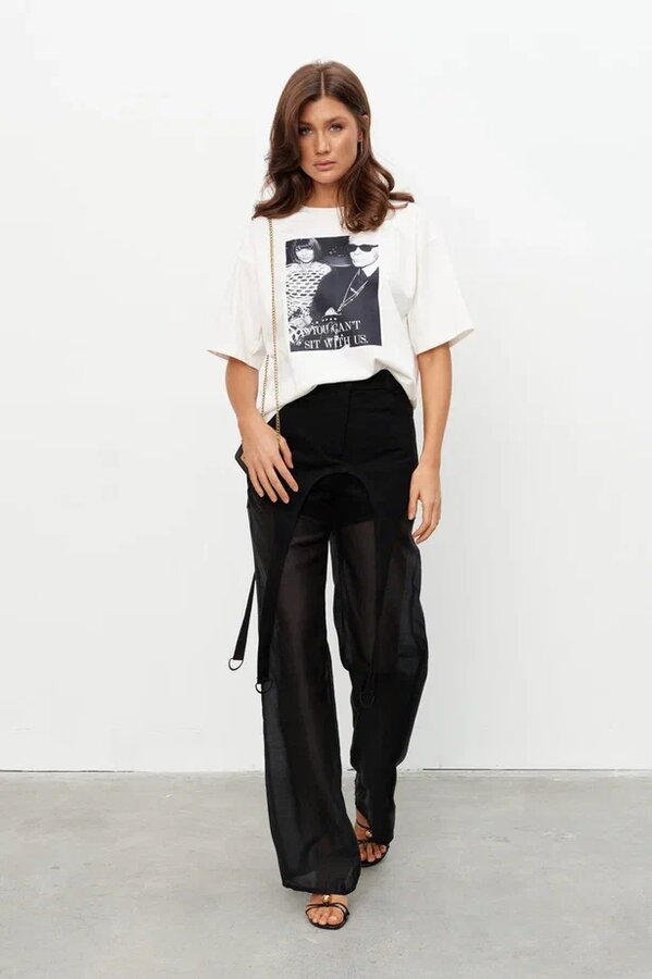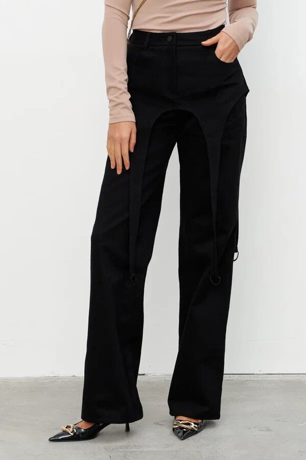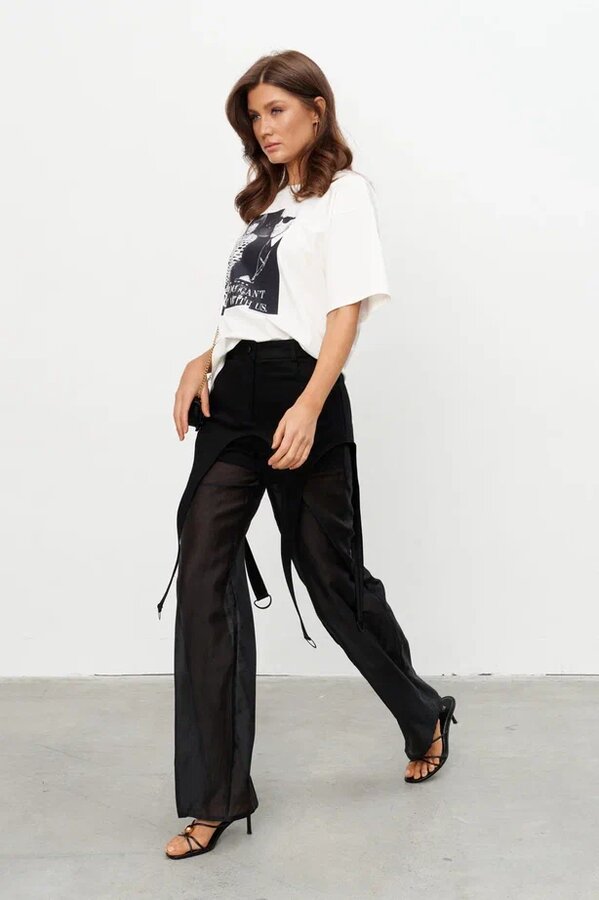 • Брюки прямого силуэта с баской выполнены на сочетании плотного джинса и полупрозрачной вискозной вуали. Брюки на поясе со шлёвками и застёжкой на пуговицу-болт и молнию. Чуть ниже шва сидения идут подрезы имитирующие по форме мини-шорты. От подрезов вниз брюки выполнены из вуали. По переду два прорезных кармана, по спинке - два накладных.