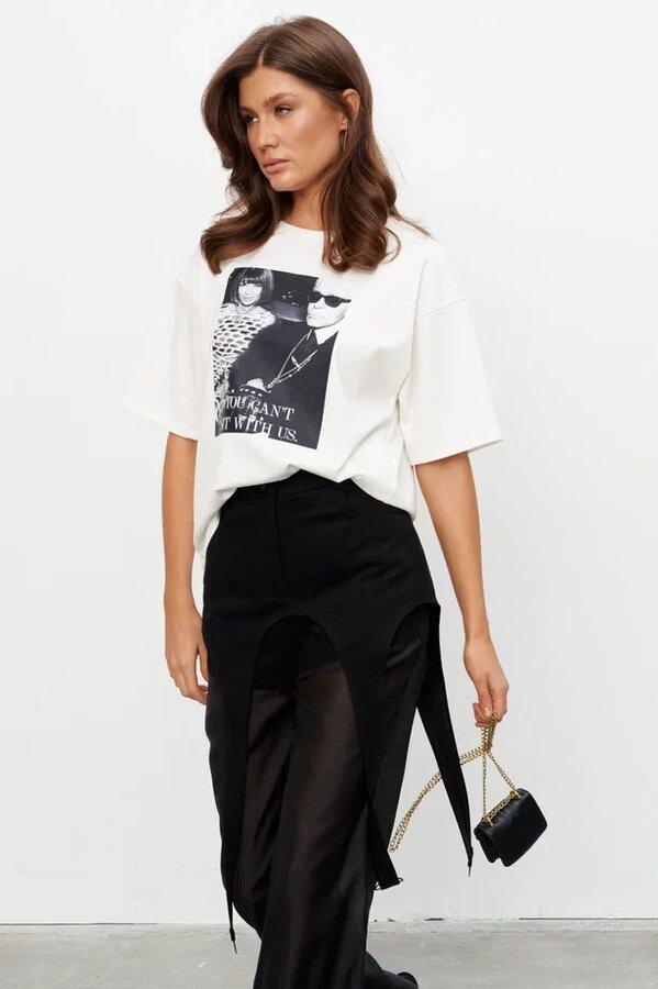 • Оверсайз футболка из плотного трикотажа с контрастным принтом «Карл». Линия плеча спущена, горловина отделана эластичной бейкой.