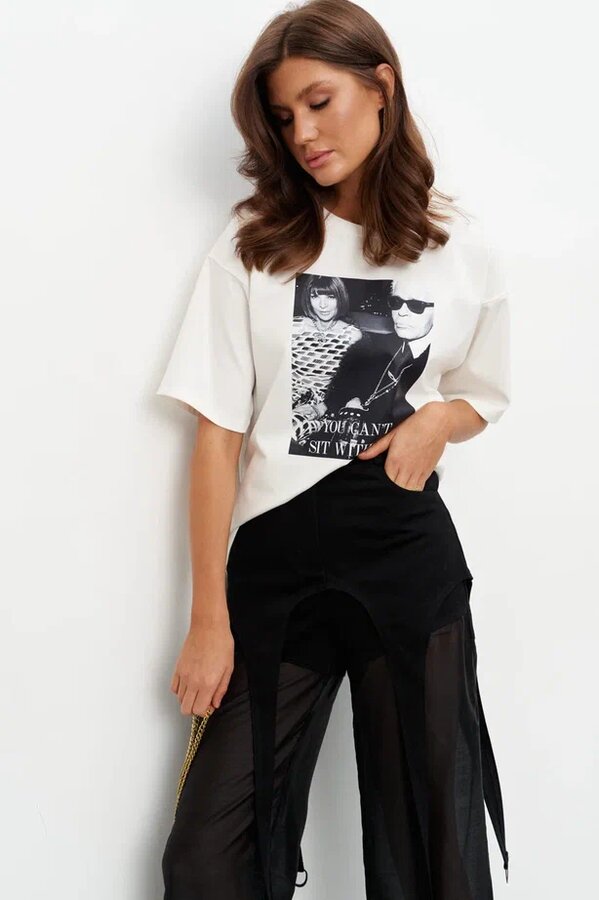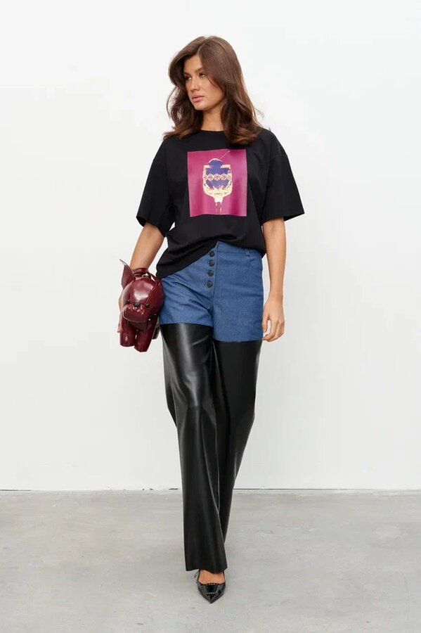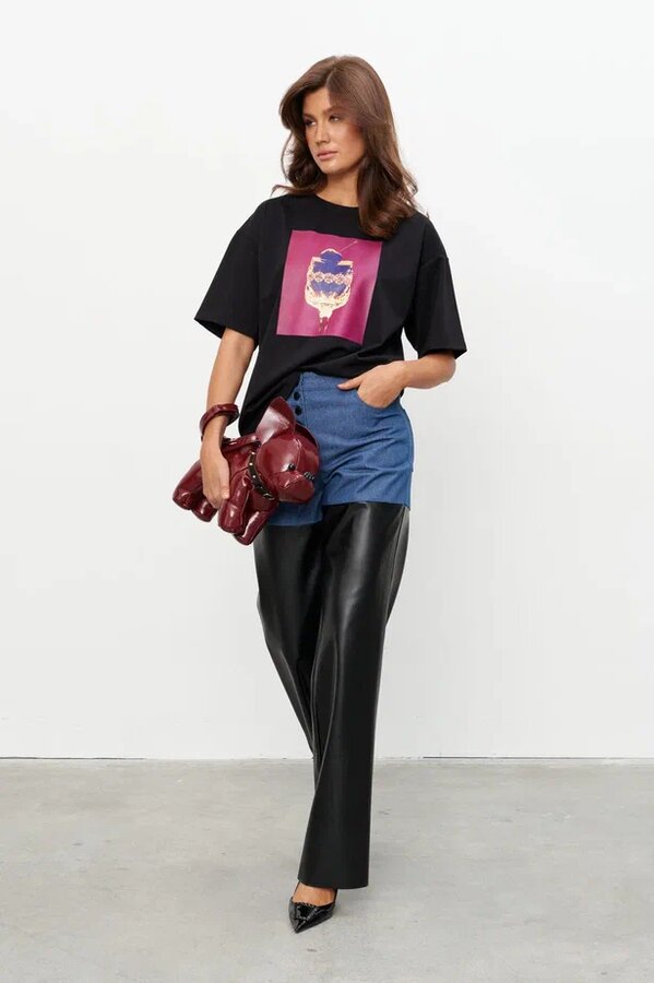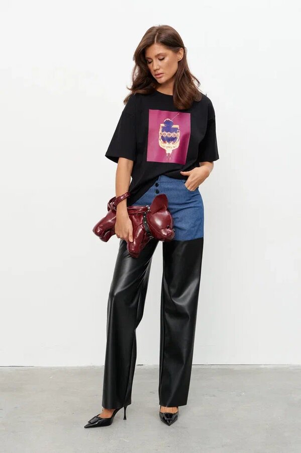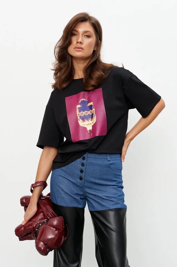 • Оверсайз футболка из плотного трикотажа с ярким принтом «бокал». Линия плеча спущена, горловина отделана эластичной бейкой.