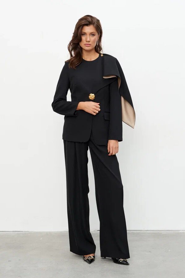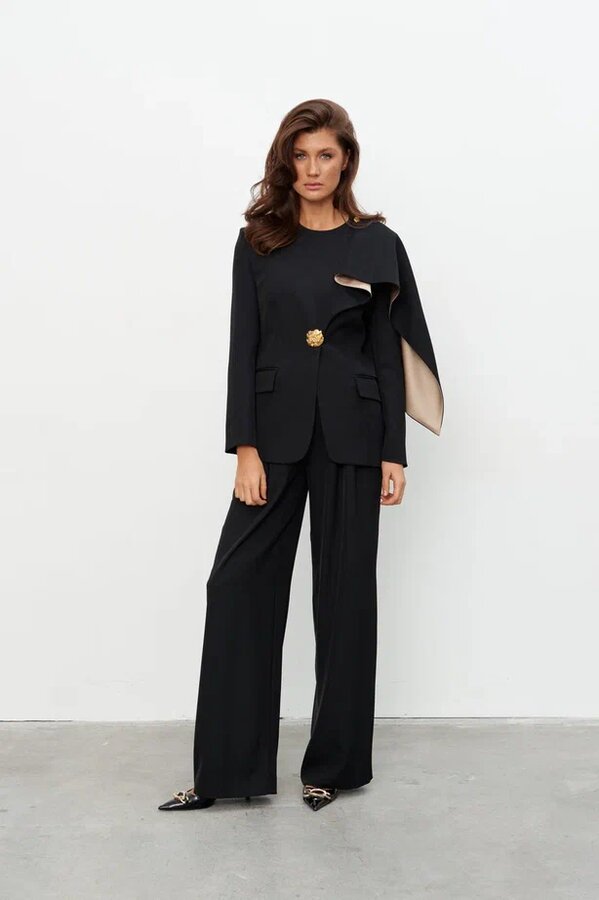 "•Комплект состоящий из жакета и брюк выполненных из струящейся ткани. Жакет асимметричного кроя с правым бортом переходящим в шаль, которая перекидывается на спину и фиксируется золотой пуговицей возле горловины. Жакет с плечевыми накладками, по переду два прорезных кармана с клапанами. Застёжка на массивную золотую кнопку. Изделие частично на золотистой подкладке в декоративных целях.
