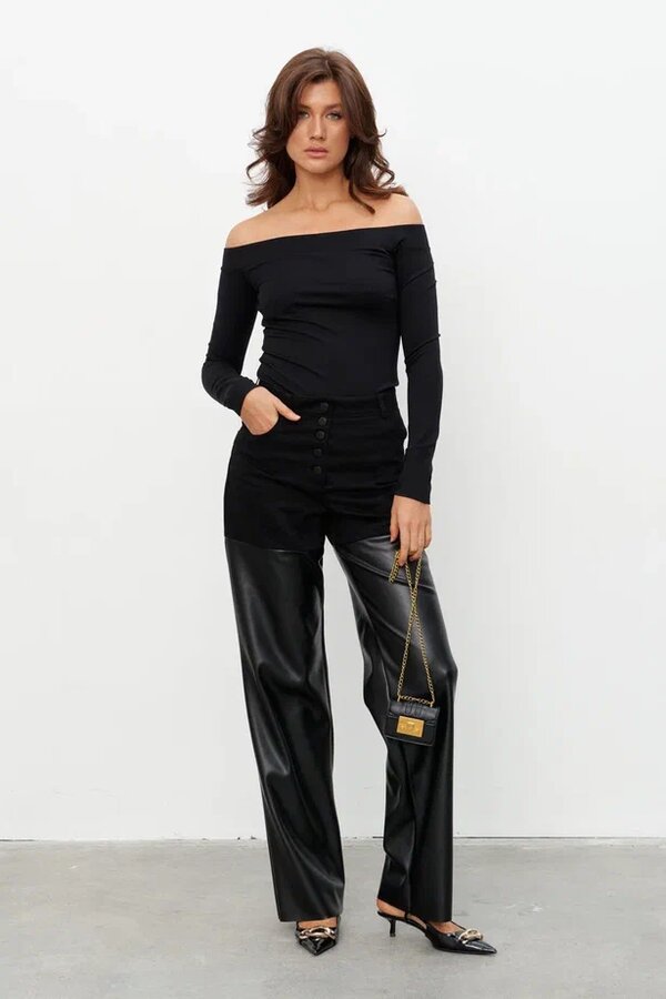 • Брюки прямого силуэта выполнены на сочетании плотного джинса и экокожи. Брюки на поясе со шлёвками и застежкой на металлические пуговицы-болты. По переду два прорезных кармана, по спинке - два накладных. Длина брюк от талии 44-48р - 109 см 50-54р - 110,5 см