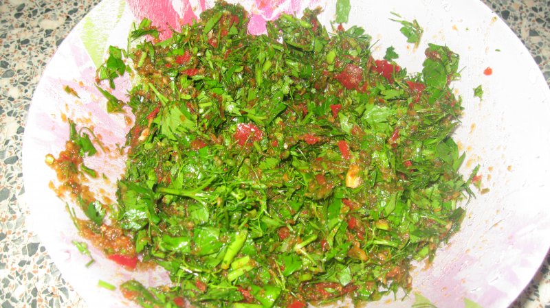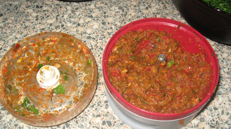 Укроп и петрушку я мелко нарезала,чеснок и горький перец перемолола в блендере.