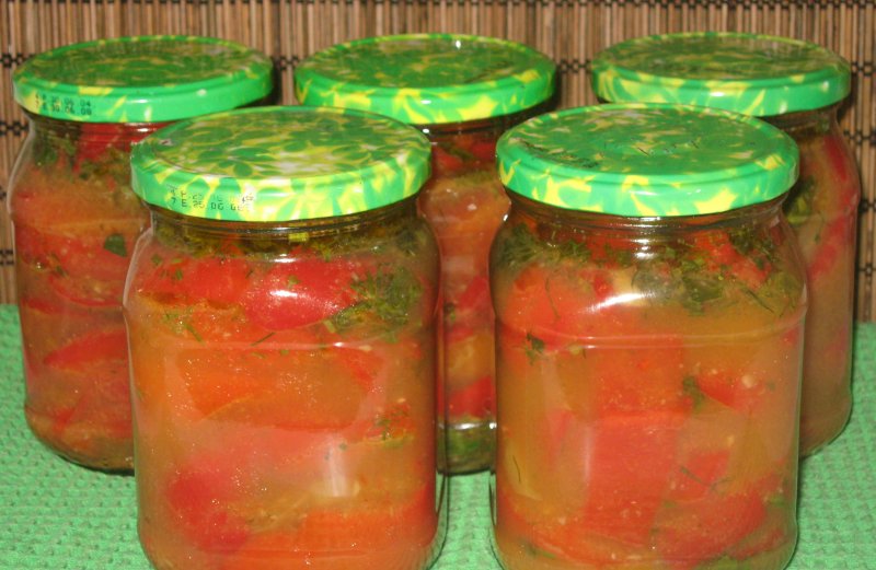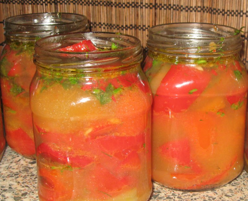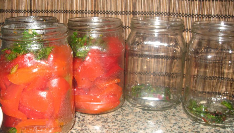 Отваренный перец складываем в стерилизованные банки и перекладываем смесью.