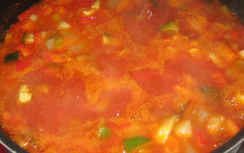 в кастрюлю к помидорам-кипятим на медленном огне-постоянно помешивая 30 минут.