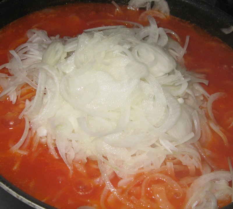 Лук нарезаем полу-кольцами,забрасываем в кастрюльку кипятим 10 минут.