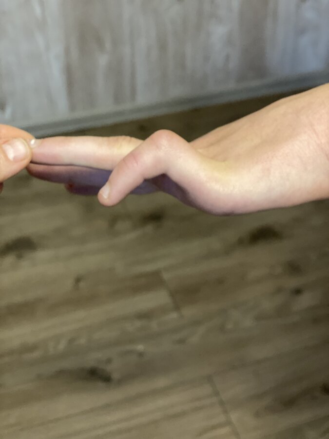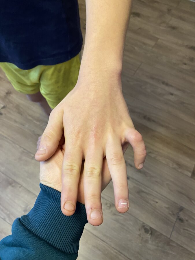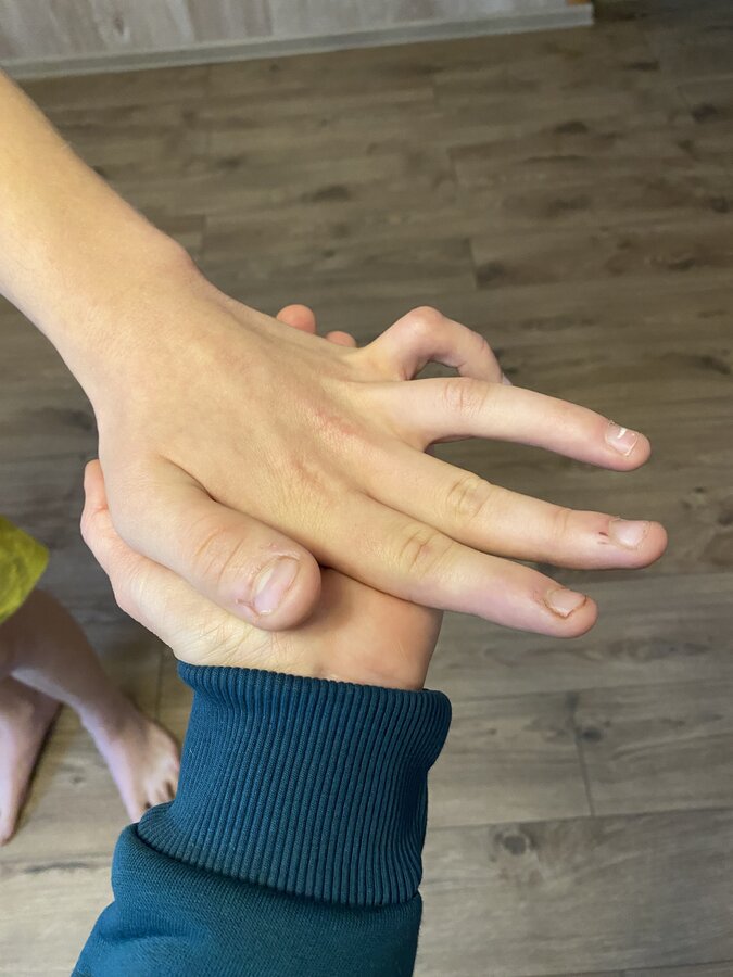 И параллельно хочу показать кисть правой руки ( мизинец), он всегда был в слегка согнутом состоянии, врачам показывала регулярно, но они говорили что это особенность развития и ничего сделать нельзя. Палец все больше сгибается и начал беспокоить ребенка , особенно на холоде. Все остальные пальцы нормальные. Этот мизинец не разгибается больше 90 градусов ( и никогда не разгибался)