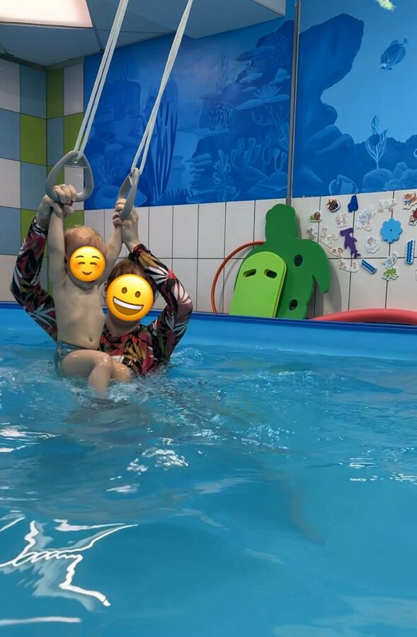 Тренера делают упражнения в бассейне: ребенок висит на кольца, тренер обхватывает запястья ребенка и кольца и «качает» ребенка вперед-назад. Ноги ребенка частично в воде. Ребенок будто бежит, перебирает ногами.