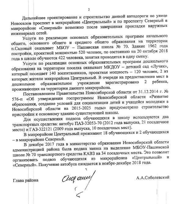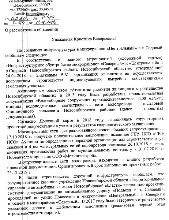 Тут на меня на днях нашло вдохновение - забросала письмами разные ответственные органы на счет коммуникаций в нашем микрорайоне. Получила ответ пока из Администрации Новосибирского района. Скан ответа привожу ниже....