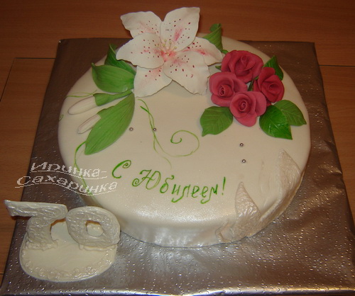 торт покрыт мастикой,цветы из неё же.Цифра из шоколада.