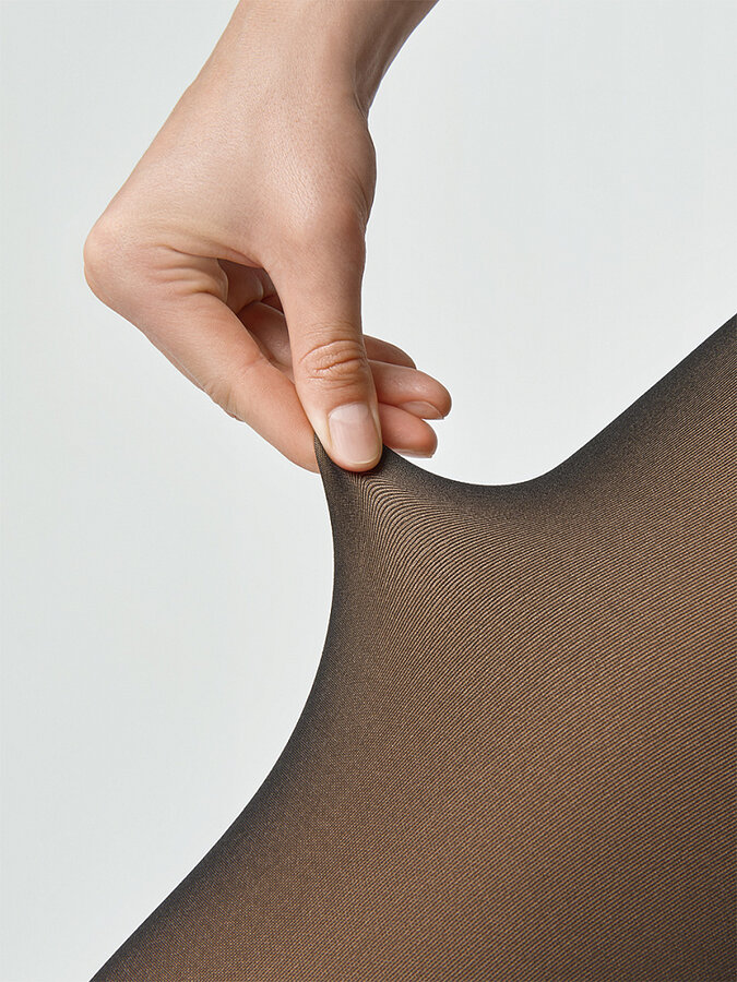 При производстве используются два вида пряжи и специальная технология вязания, благодаря которой создается эффект тонких полупрозрачных колготок. Широкий пояс, плоские швы и гигиеничная ластовица создают максимальный комфорт. Ступня модели выполнена без утепления флисом, поэтому колготки удобно носить как с зимней обувью, так и с туфлями.