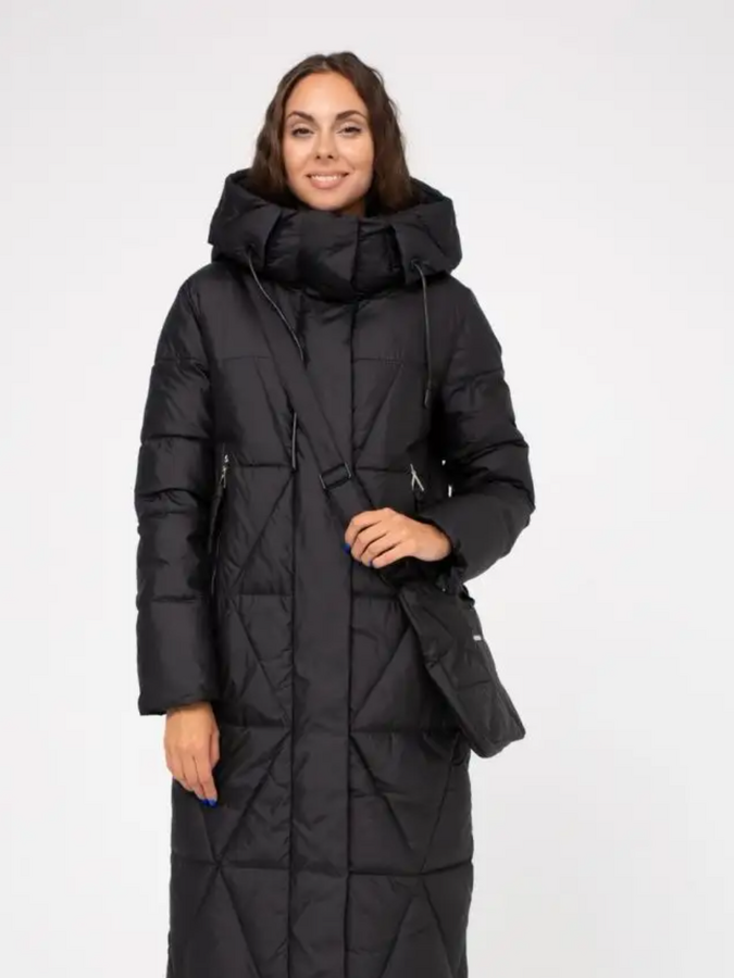 Модель утеплена утиным пухом и пером. Особенности: фиксированный капюшон с отстежным мехом, застежка на молнию и пуговицы, четыре кармана, стеганая подкладка.