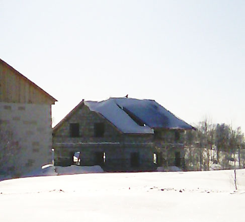 Вот такие наметы снега бывают. На профлистах, как ни странно, такие же. Хорошо, если не над крыльцом. По дороге в Ключи, в местах, где ветра поменьше, там вообще, такие фигуры замысловатые на крышах с одной стороны, у нас еще более-менее. И, самое, главное, стена далеко от сугроба, по ней не потечёт. Ну, имеется в виду, когда стены будут :oops: Но муж все равно собирается намёт лезть снимать.