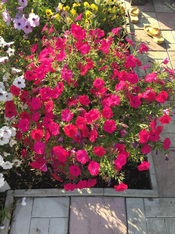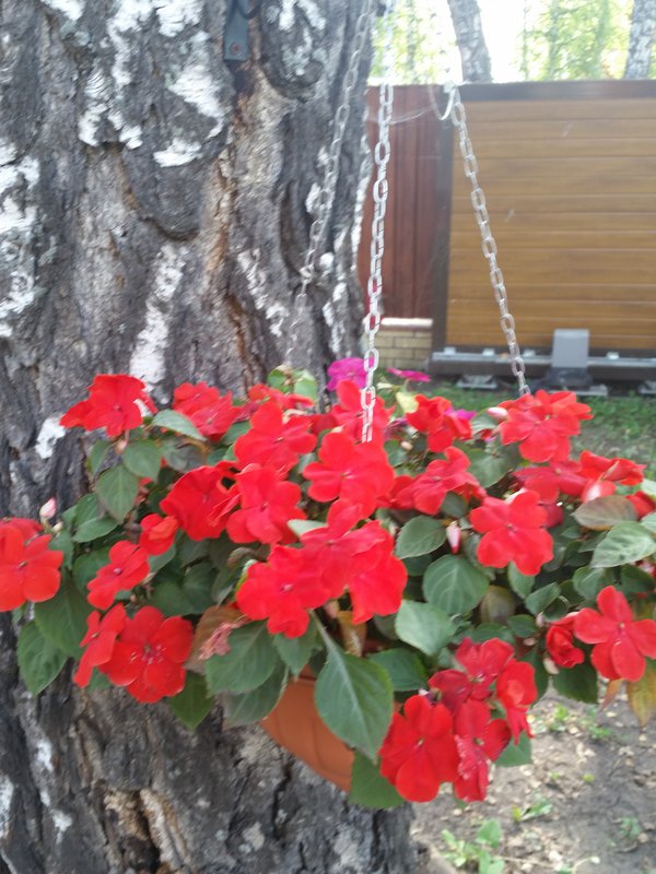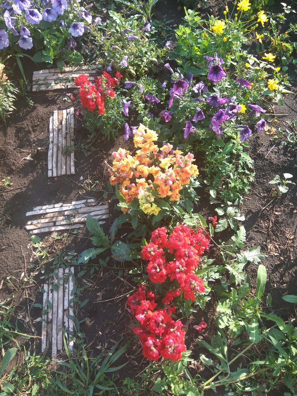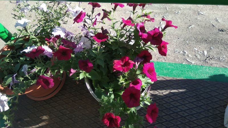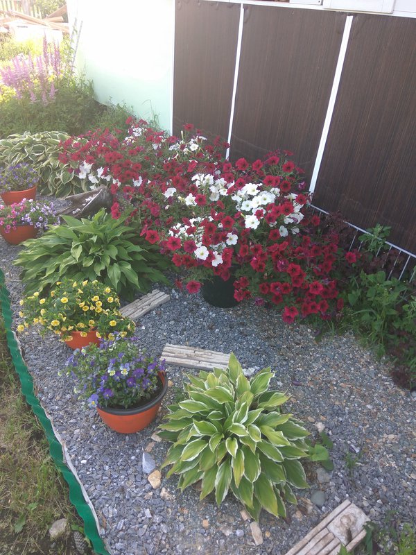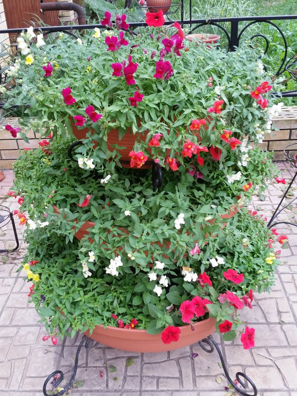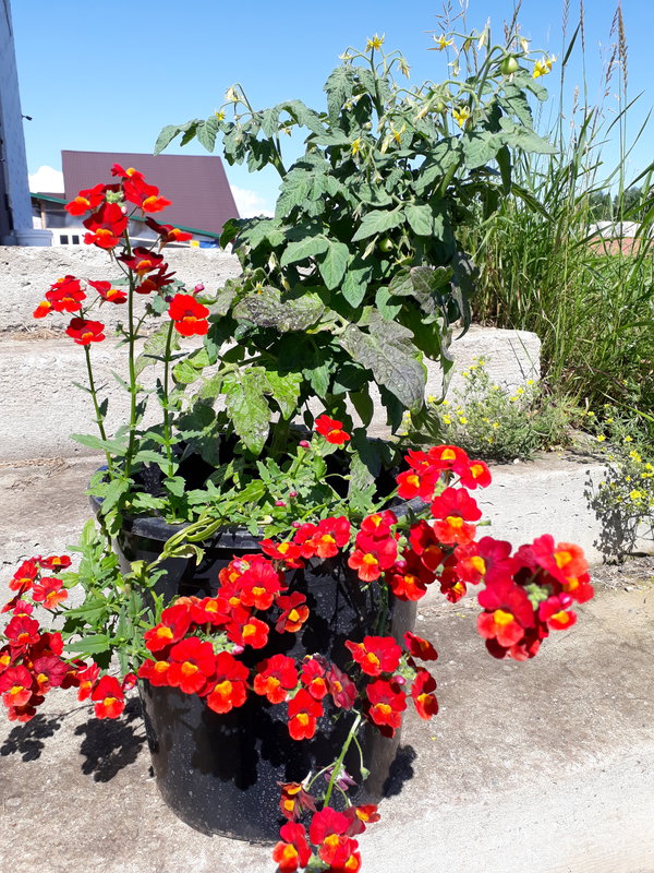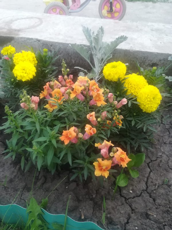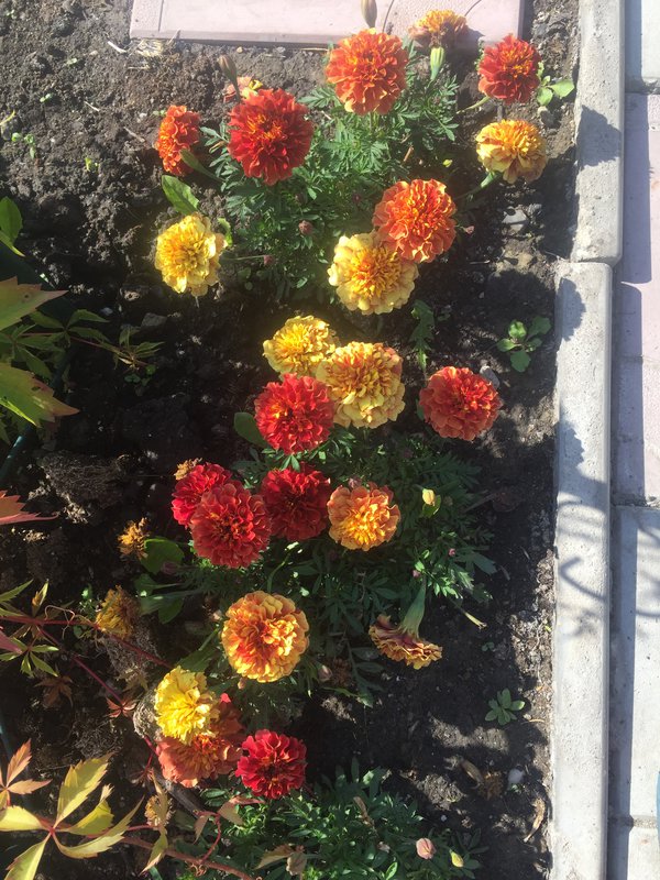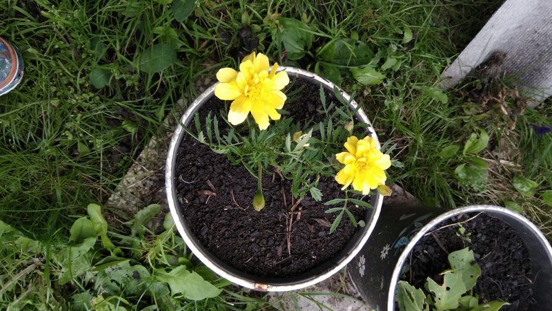 бархатцы в этом году поздновато взошли с таким маем ( я сеяла на улице в рассадник) цветут сейчас вовсю, а что в горшке, так петуньку залило и пересадила их туда