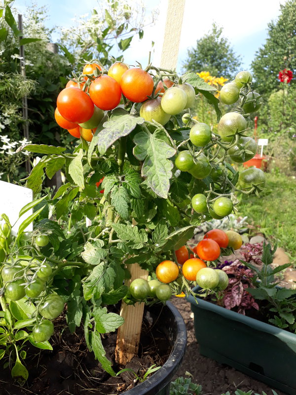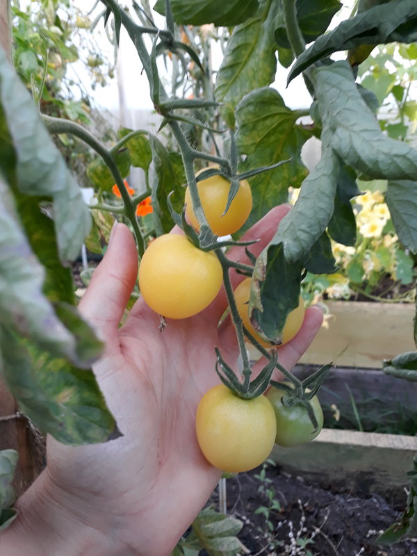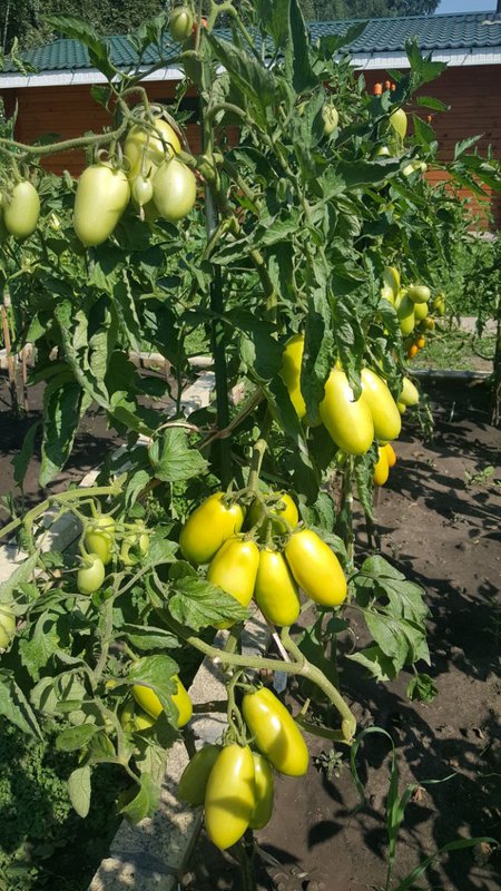 Оля. На заднем плане за мавром справа мирабелла типа "белый" томат на самом деле очень бледно-желтый. Размер чуть больше черри. Мягкий нежный вкус для соусов, не лежкий, удобный, зрелые плоды опадали. Детям нравился нежный. Если и буду садить то только 1 куст для ассортимента.