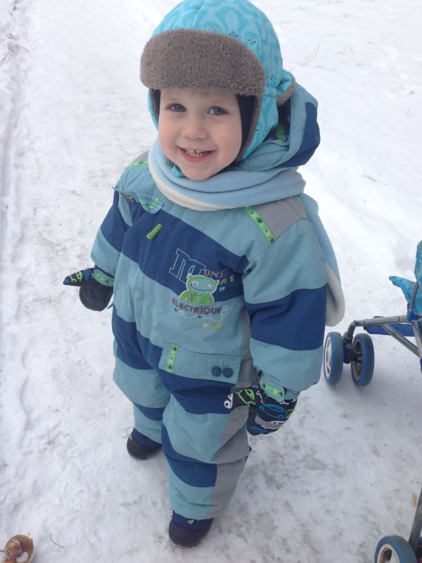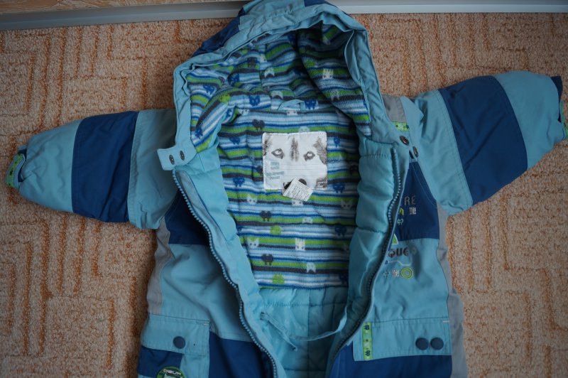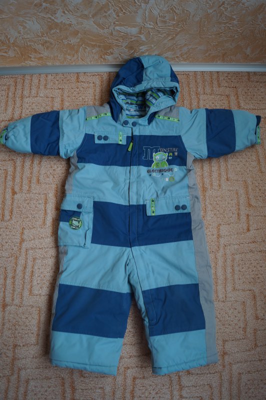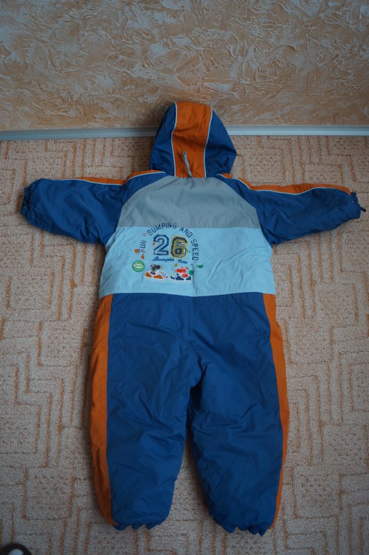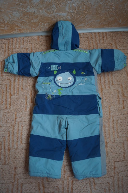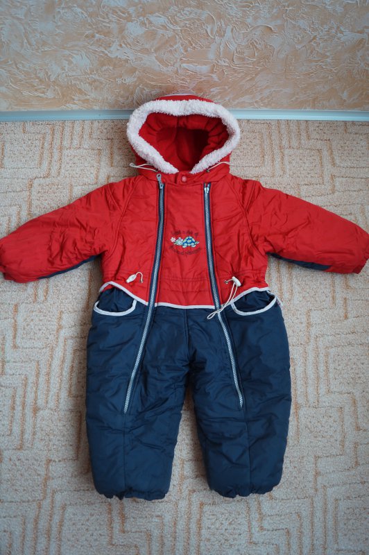 2. Комбинезон зимний, Дю па дю, размер 24мес. Теплый, легкий, удобный. Есть снегозащитные резинки на штанинах. Пошорканы штанины внизу, нет одной кнопки на кармане. В остальном все нормально. 1800руб