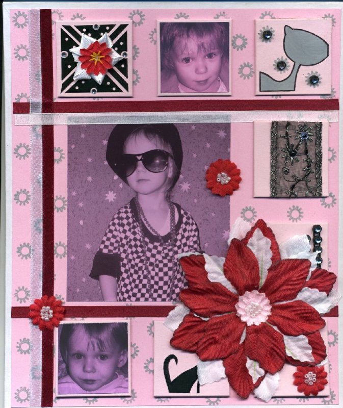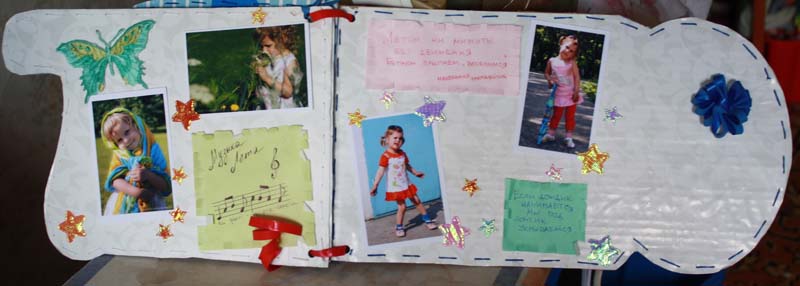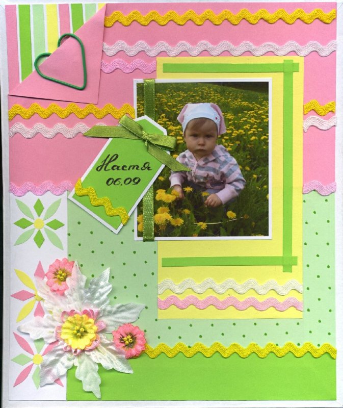 Это моя племянница. Страничка из её будущего альбома. Использованы обычная цветная бумага. Ленты (приобретены в Логосе) и искуственные цветочки. Все оформлено на толстом картоне.