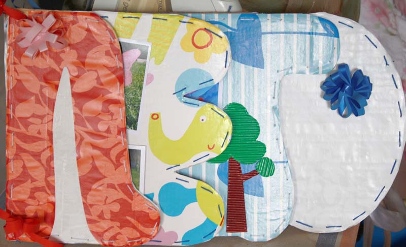 Использовала обёрточную ИКеевскую бумагу, их же ленту подарочную, клей канцелярский и ПВА, сама делала цветочки из ленты, есть элемнты выполненные техникой рваного края, так же гофрированный картон и пуговки, контурный карандаш