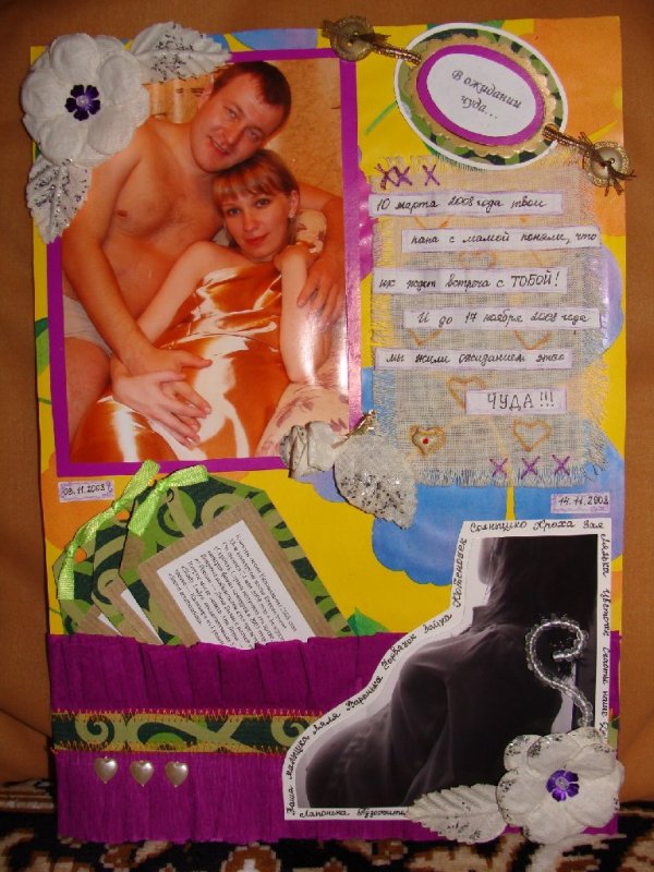 мне больше всего третья страничка понравилась. что касается критики (вы сами просили:), то на второй страничке не нравится обрезанная голова на фото снизу. а первая показалась немного мрачноватой, что ли, несмотря на розовый фон и вообще-то очень радостную тематику. но это, наверное, из-за обилия снимков узи. сама скоро займусь подобной страничкой и пока думаю, как сделать ее яркой, чтобы темные снимки не затемнили ее._________________ ![]() |