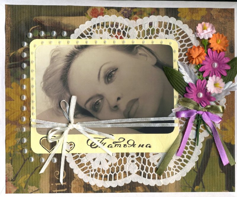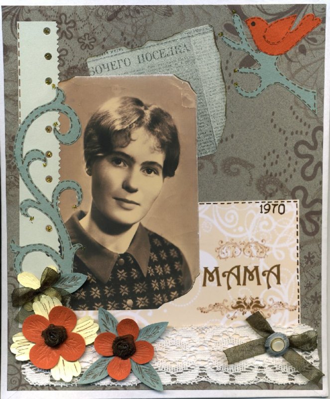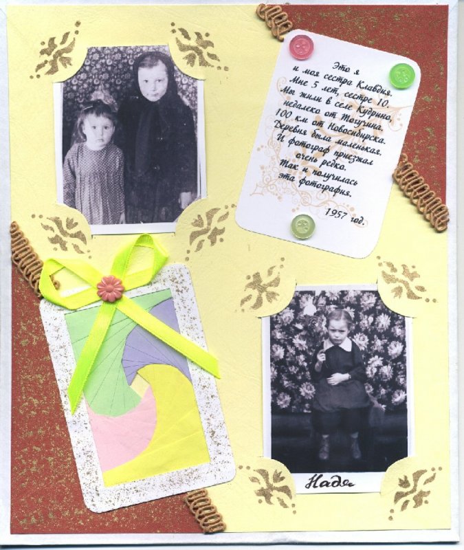 А это страничка из будущего альбома моей мамы. На ней она и изображена (внизу). Использованы: цветная бумага, трафарет по углам фото сделала сама, так на скорую руку, акриловая краска золотая, пуговички, ленты (как всегда из магазина Логос). Надпись сделана в фотошопе и распечатана на цветном принтере.