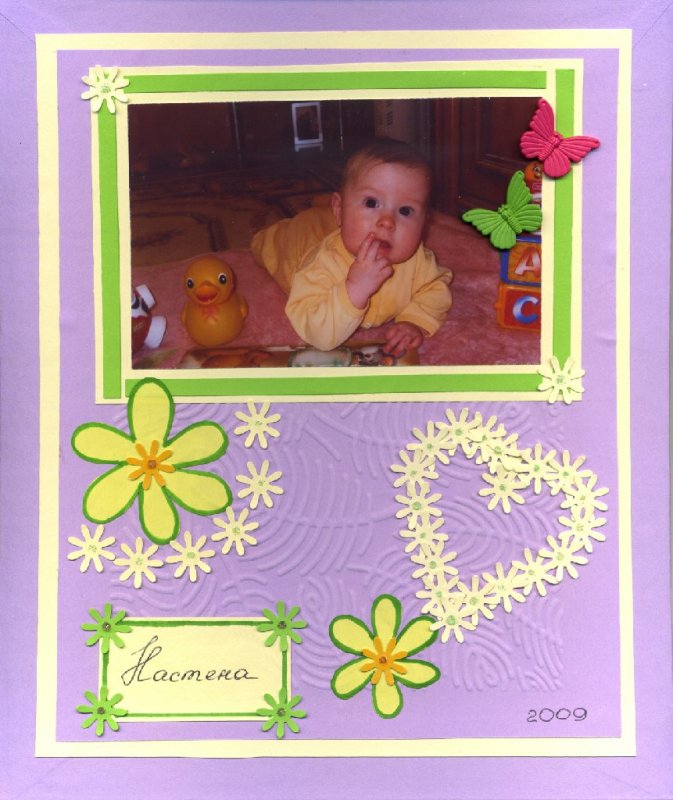 Страничка для моей племянницы. Цветочки сделаны компостером "маргаритка". Две бабочки - это пуговицы.