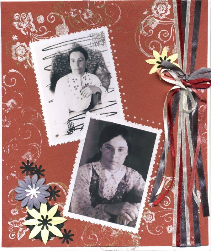 Это еще странички для альбома моих родителей. Слева бабушка (там, кстати использовала купленный в магазине Good-Hobby штамп "полет бабочки"), справа мама (фон для этой странички сделала в фотошопе).