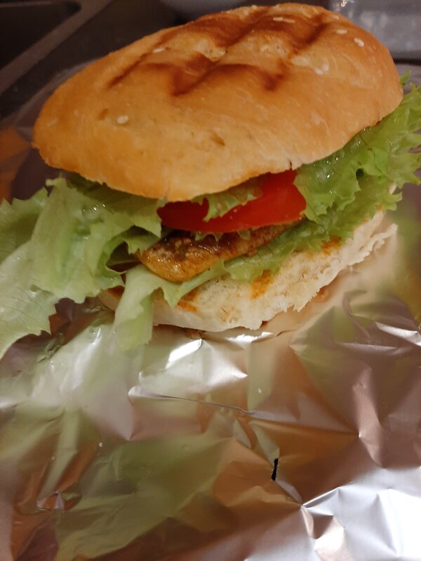 Хлебушек подсушенный, курица, листья салата, помидорка.