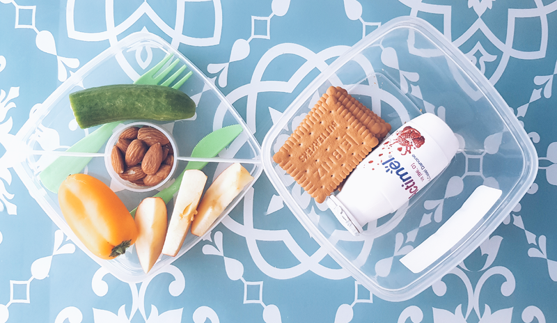 Племянница в школу ходит, ей дают с собой всегда чай в термосе с поильником-трубочкой и бутерброд. Изредка бананы сушеные в упаковке.