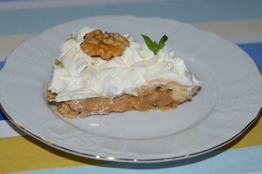Сгущёнку прогреть, так она лучше будет намазываться. Порезать бананы. Достать основу. Выложить сгущёнку, разровнять. Выложить бананы.