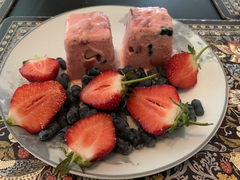 В формочки выложила кусочки клубники, жимолость и кусочки безе в перемешку со взбитыми сливками. Сливки взбивала с клубникой и сахарной пудрой. Заморозила.