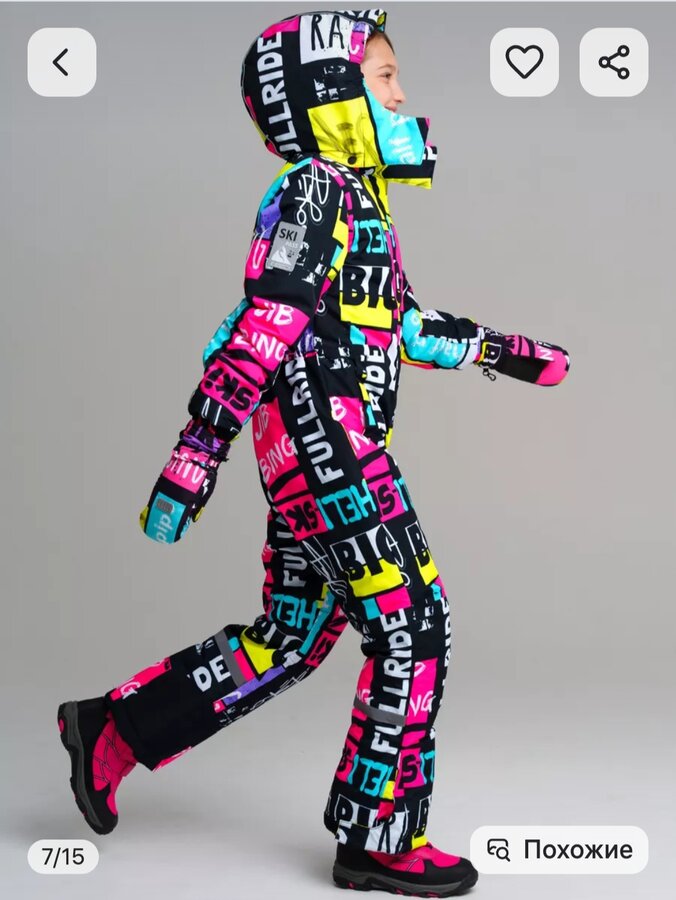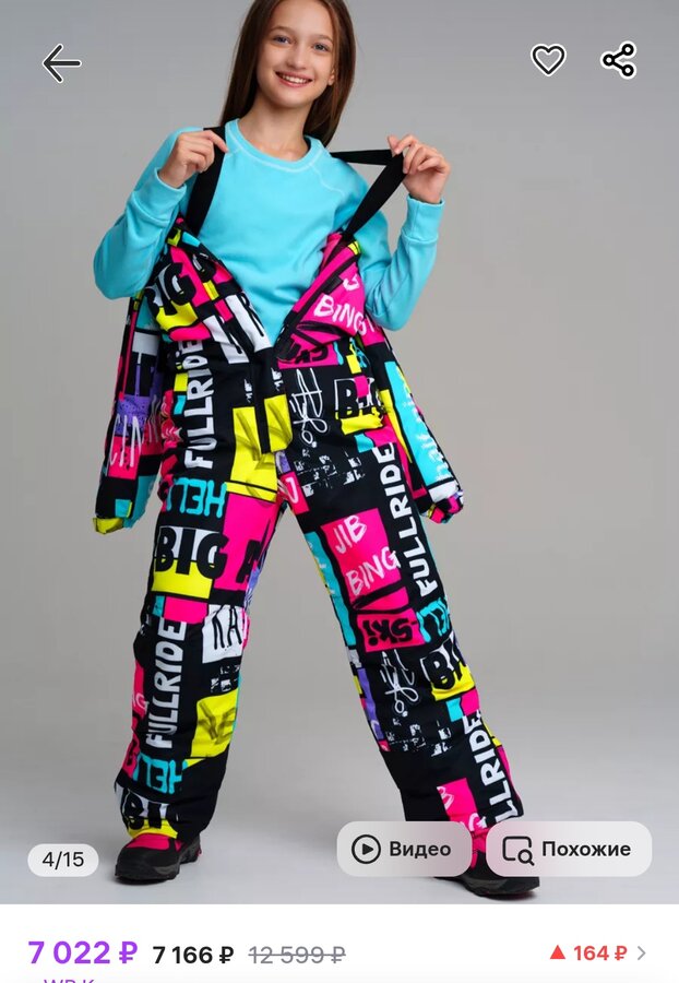 прочная ткань, подтяжки снимаются, есть защита от снега и молнии внизу штанин.