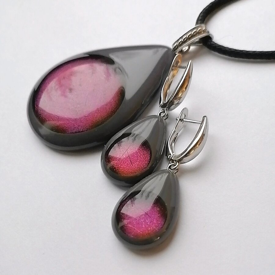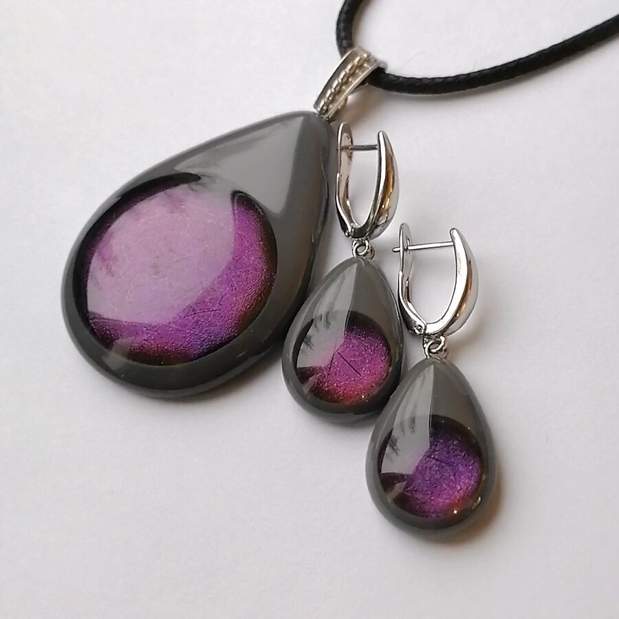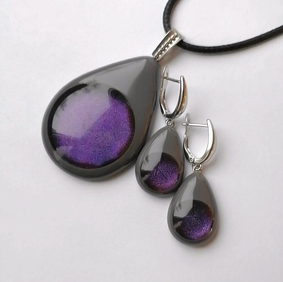 Комплект украшений. Выполнено из стекла с авторским плавлением. Декор меняет перелив в зависимости от света и угла зрения.