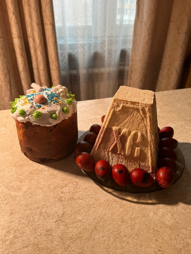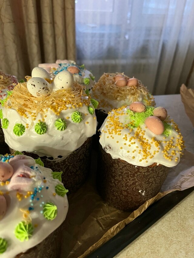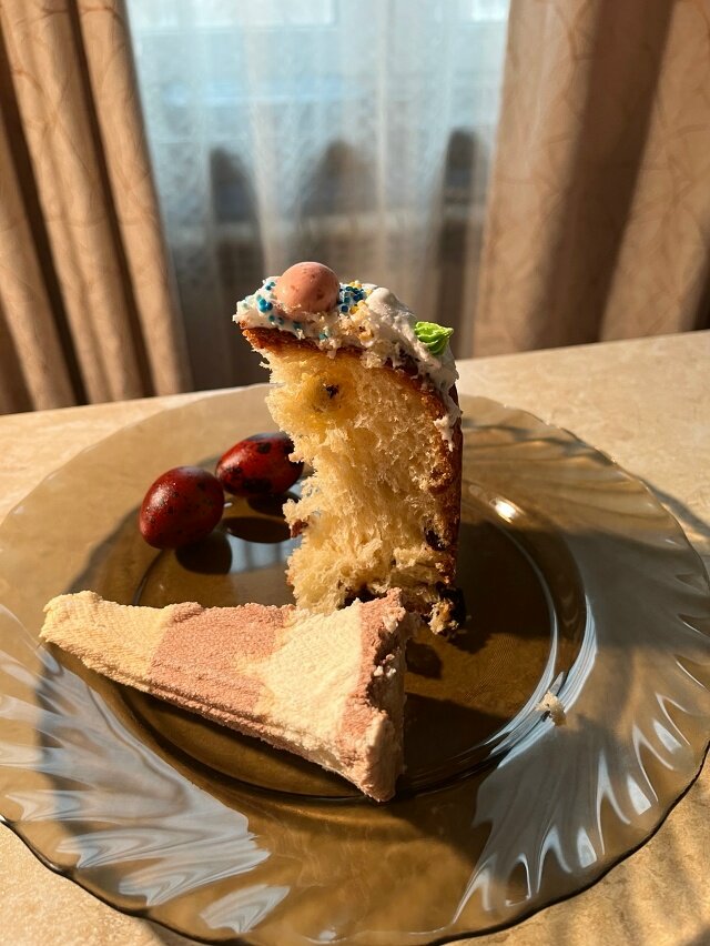В этом году то же делала подобные куличи. Только яйцо не взбивала, а масло вводила холодное. Резала небольшими кусочками и вмешивала. Тестомеса, конечно же, дома нет, все ручками. Час где то вмешивала, с перерывами на отдых рук. Посследняя расстойка была холодной. Весь процесс занял 20 часов.