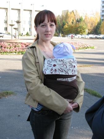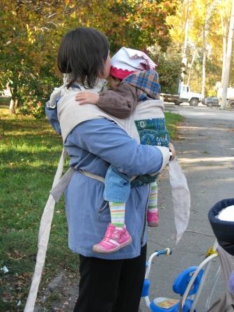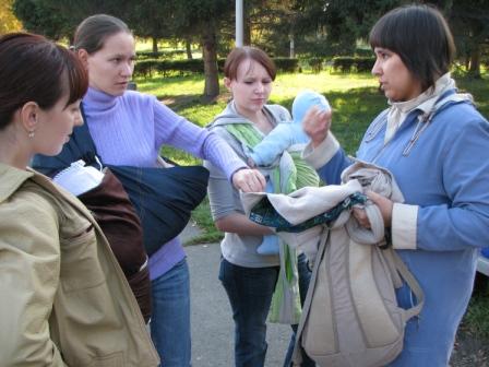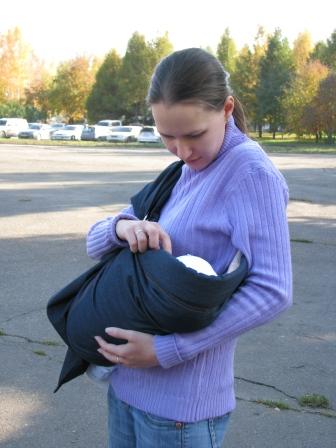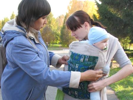 Юля с Галиной помощью пробует слинг. :-)