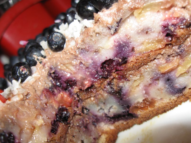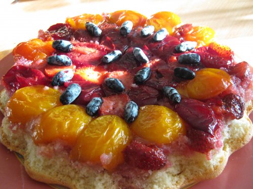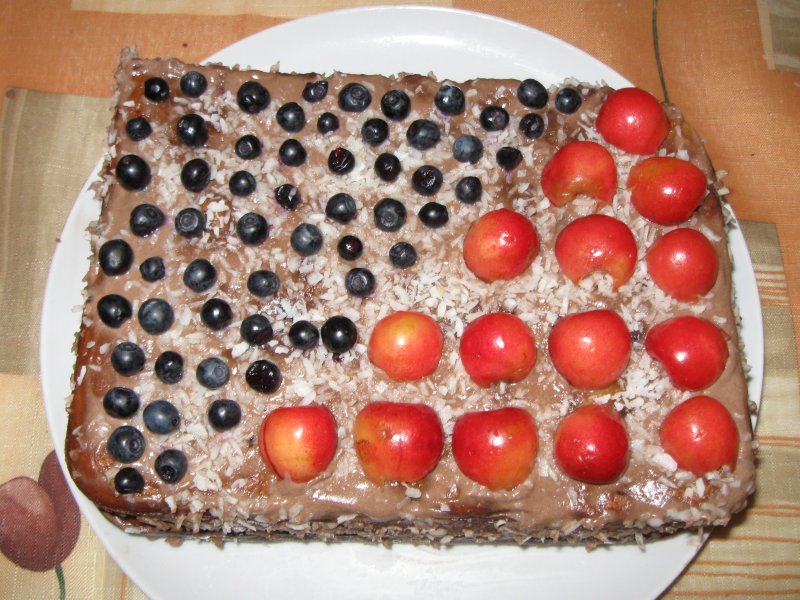 Правда, в процессе готовки мне высказали пожелание "тортика бы" поэтому пришлось изображать псевдо-тортик: разрезала пирожок пополам, промазала сметанным кремом с добавлением какао, его же наверх, присыпала кокосовой стружкой и свежими ягодками вроде как украсила видок, конечно, не ахти, но заказчику понравилось