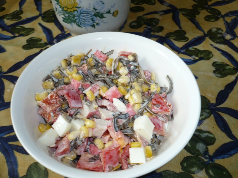 Вот вчера готовила салат, любимый моим сыном (морская капуста, кукуруза, сладкий перец, яйца, крабовые палочки)