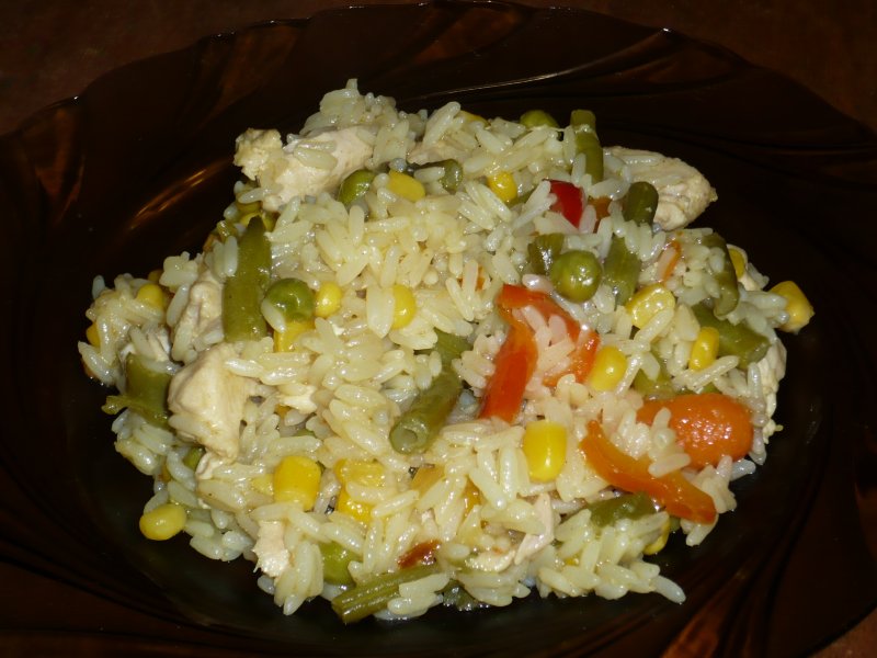 И на ужин куриное филе с овощами и рисом, из специй немного карри и дробленого перца чили