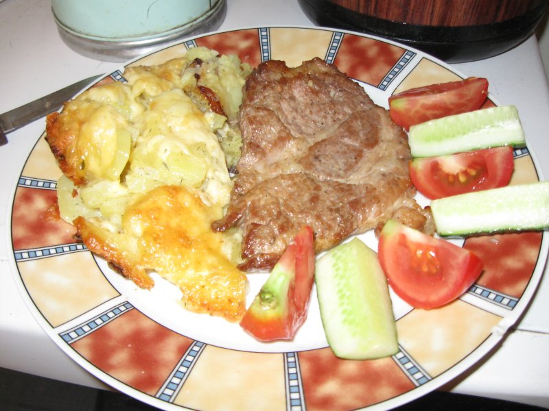 запеченая картошечка с кабачками и сыром и свинюшкина отбивная, замаринованная в соевом соусе и специях