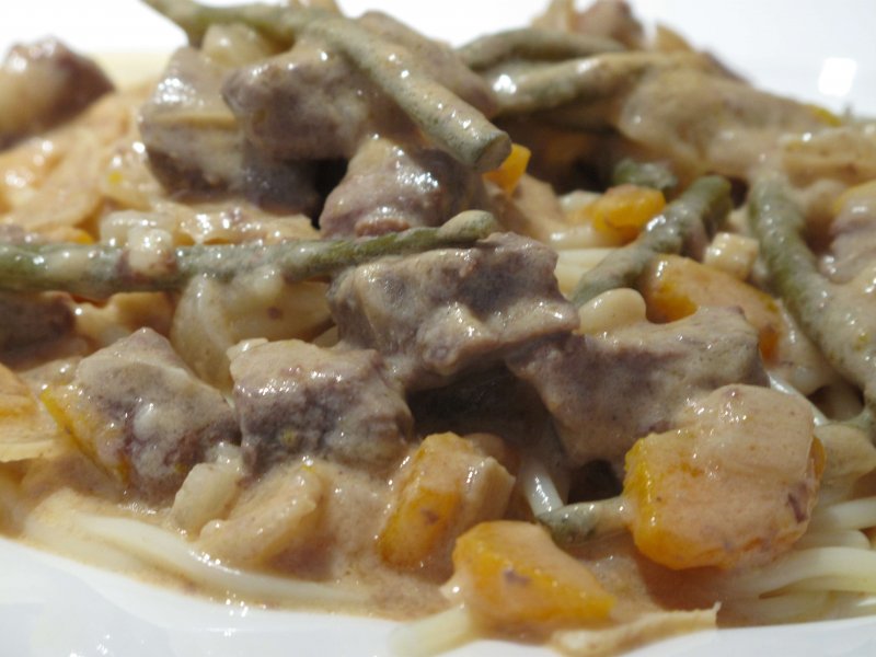 И вчера было мясо тушеное с луком, морковкой, в конце добавила сметану и фасоль. На гарнир спагетти