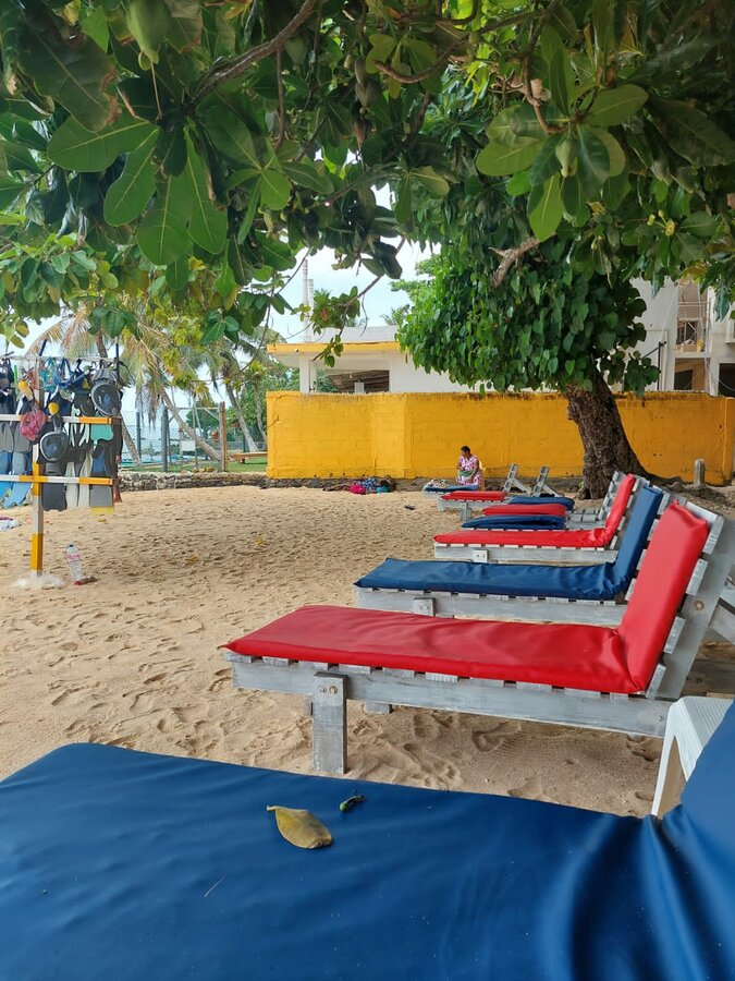 Шезлонги есть платные. Но мы сидели на лодке или на лианах и нам нравилось. Очень по простому всё, но мне лишь бы пляж был рядом от отеля и океан тихий.